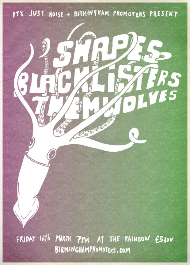 This is the wicked cool poster for our next gig, designed by Brid Rose. We’ve got local favourites SHAPES, Leeds noise rock kings BLACKLISTERS (check out their awesome interactive Trickf**k video here), and new Brum based noise-mongers THEM WOLVES. Awesome.